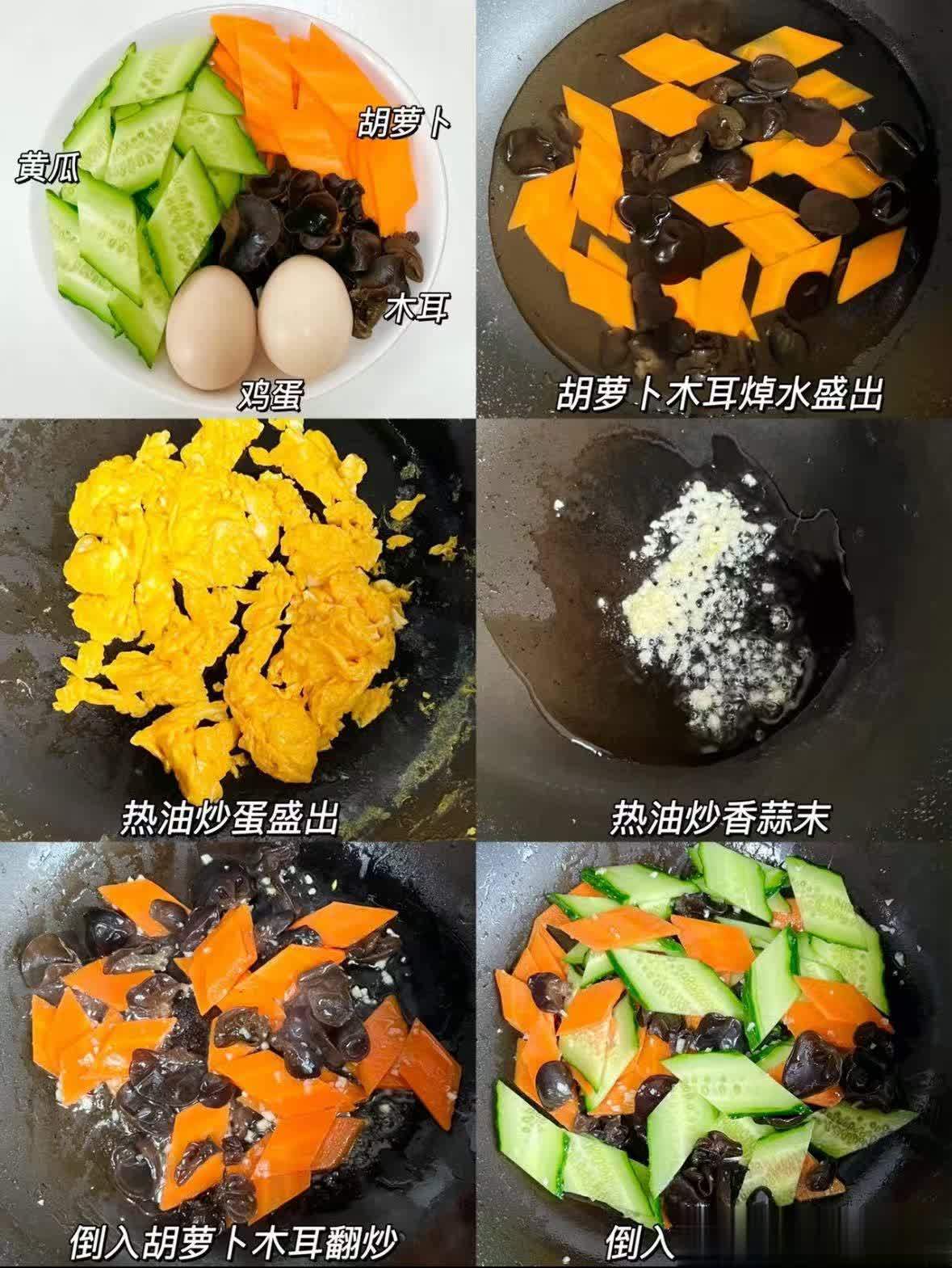 1.先将胡萝卜和木耳焯水后盛出,鸡蛋热油炒熟盛出。