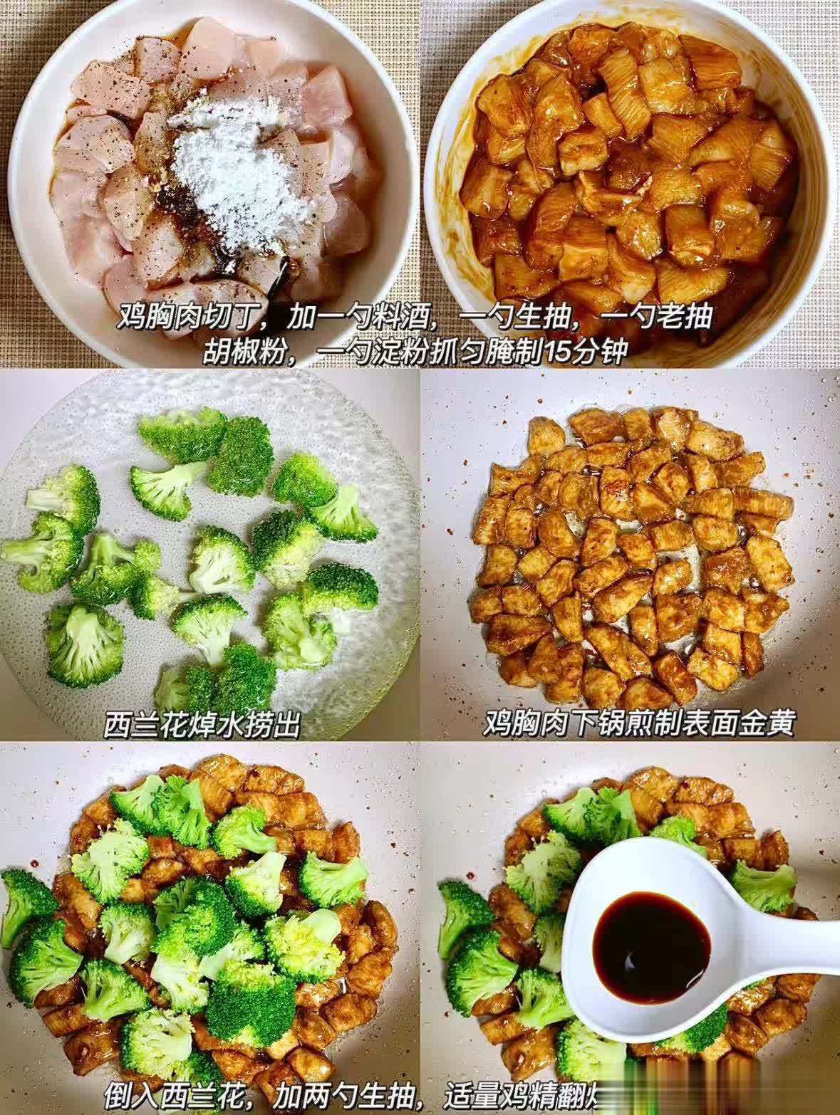 食材:鸡胸肉、西兰花、料酒、生抽、老抽、胡椒粉、淀粉、鸡精。