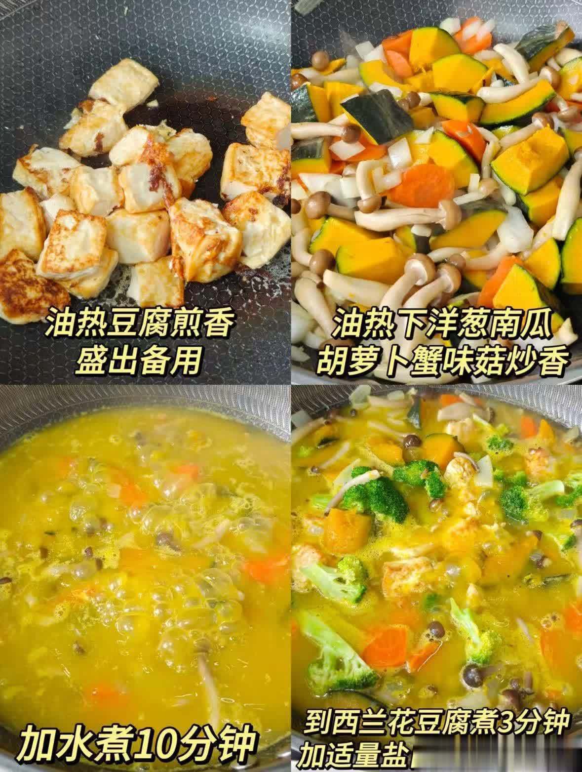 食材:豆腐、洋葱、南瓜、胡萝卜、蟹味菇、西兰花、盐、白胡椒粉。