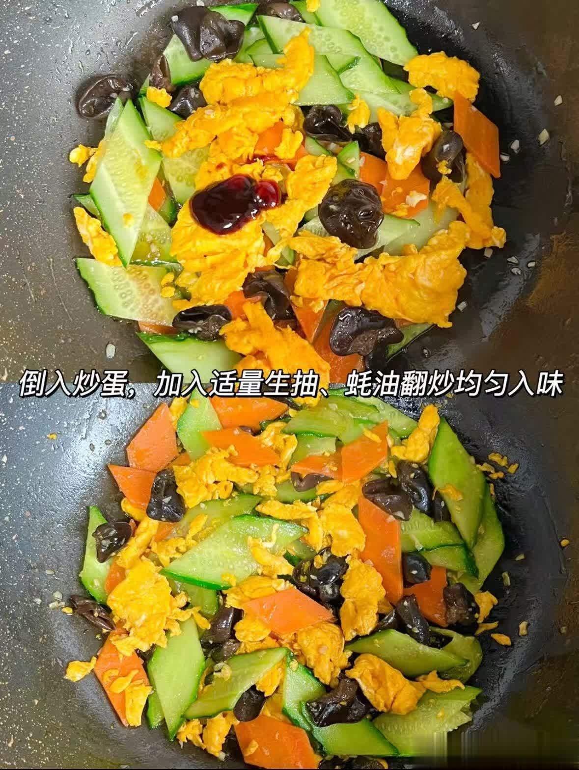 3.接着加入黄瓜翻炒,最后倒入炒好的鸡蛋,加入适量生抽、蚝油,翻炒均匀让食材入味即可出锅。