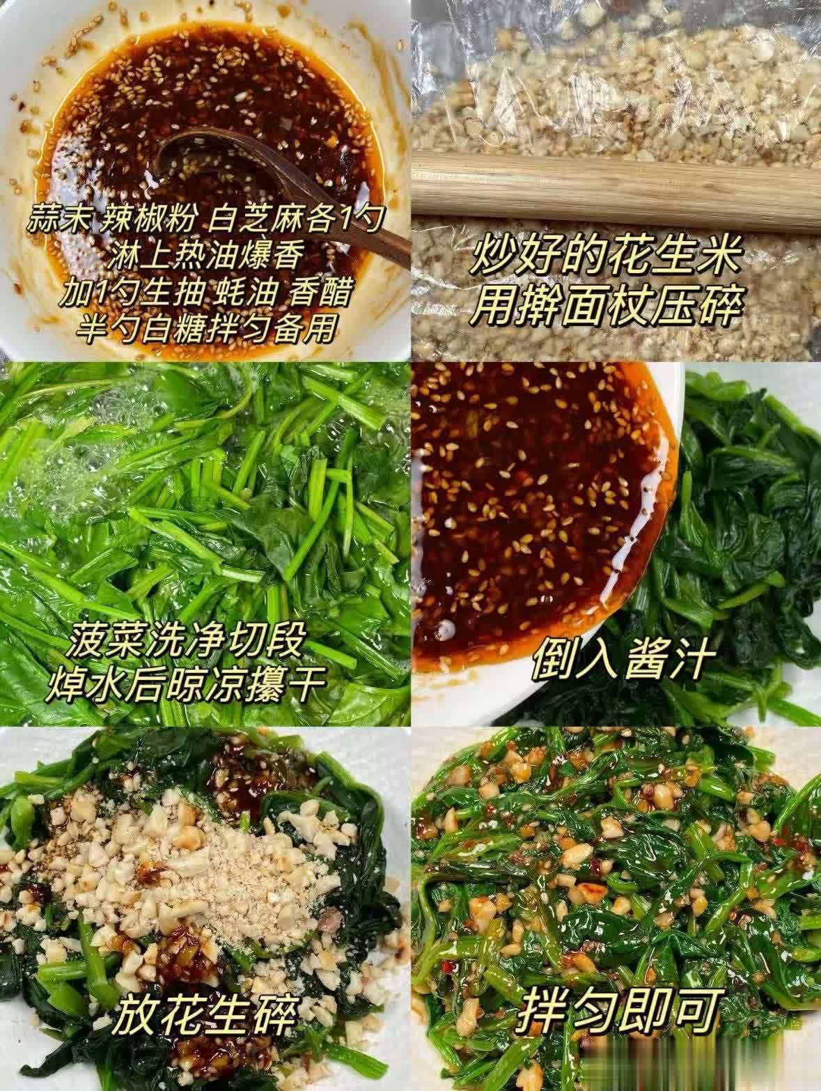 食材:菠菜、蒜末、辣椒粉、白芝麻、生抽、蚝油、香醋、白糖、花生米、热油。