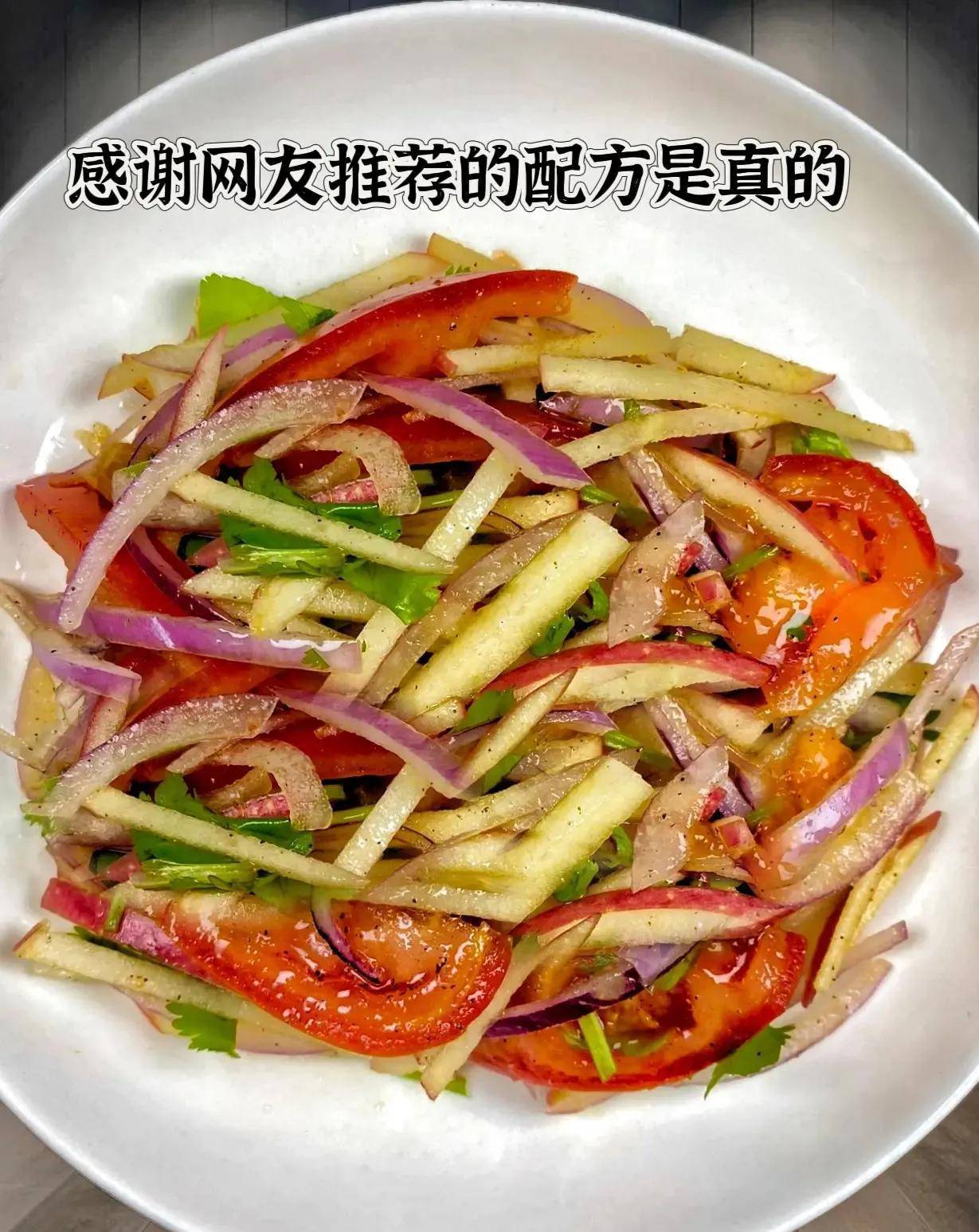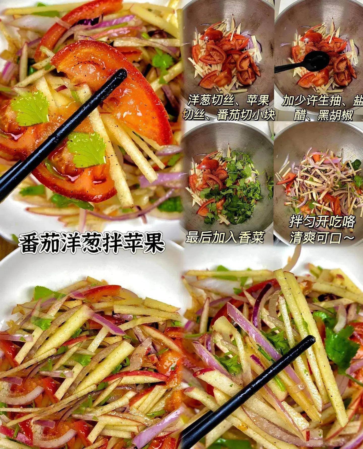 但更绝的是番茄洋葱拌苹果——酸甜开胃,纤维倍增。番茄切丁、洋葱碎、苹果块拌一起,淋点橄榄油。番茄的维生素C + 洋葱的益生元 + 苹果的果胶,三剑客联手清理肠道。